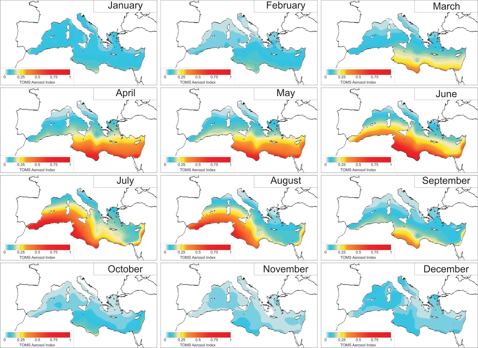 A műholdas mérések alapján megállapítható, hogy a Földközi-tenger térségében a tavaszi és a nyári hónapokban nő meg jelentősen a szaharai eredetű por koncentrációja. Keletről nyugatra haladva megfigyelhető, hogy a legjelentősebb porkifúvások időszakai egyre inkább eltolódnak a tavaszi maximumoktól a nyáriak felé. A keleti részmedencében március végétől július elejéig, a nyugati régiókban júliusban és augusztusban észlelhetők a legmagasabb aeroszol index értékek. A Földközi-tenger középső térségeiben mind a keleti, mind a nyugati részmedencére jellemző porviharos periódusok jelen vannak.